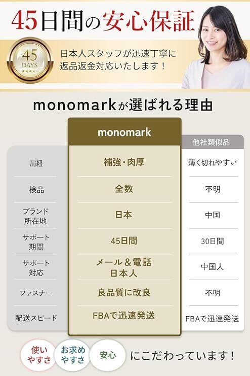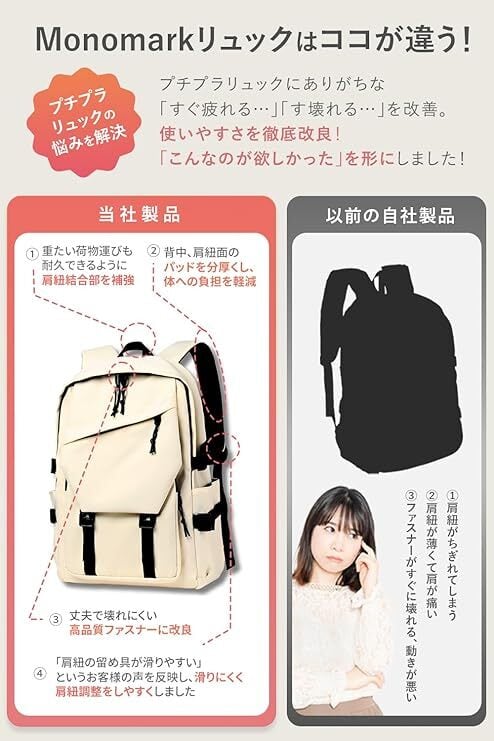 【お客様のお悩みを解消】 プチプラリュックの欠点としてあげれる点を解消に務めました。 ①日々の荷物の重さに耐久するため肩紐の補強 ②肩紐・背面のクッション性の向上 ③ファスナーはより品質の良いものに改良しております。 ④肩紐の留め具の滑りやすさを改善